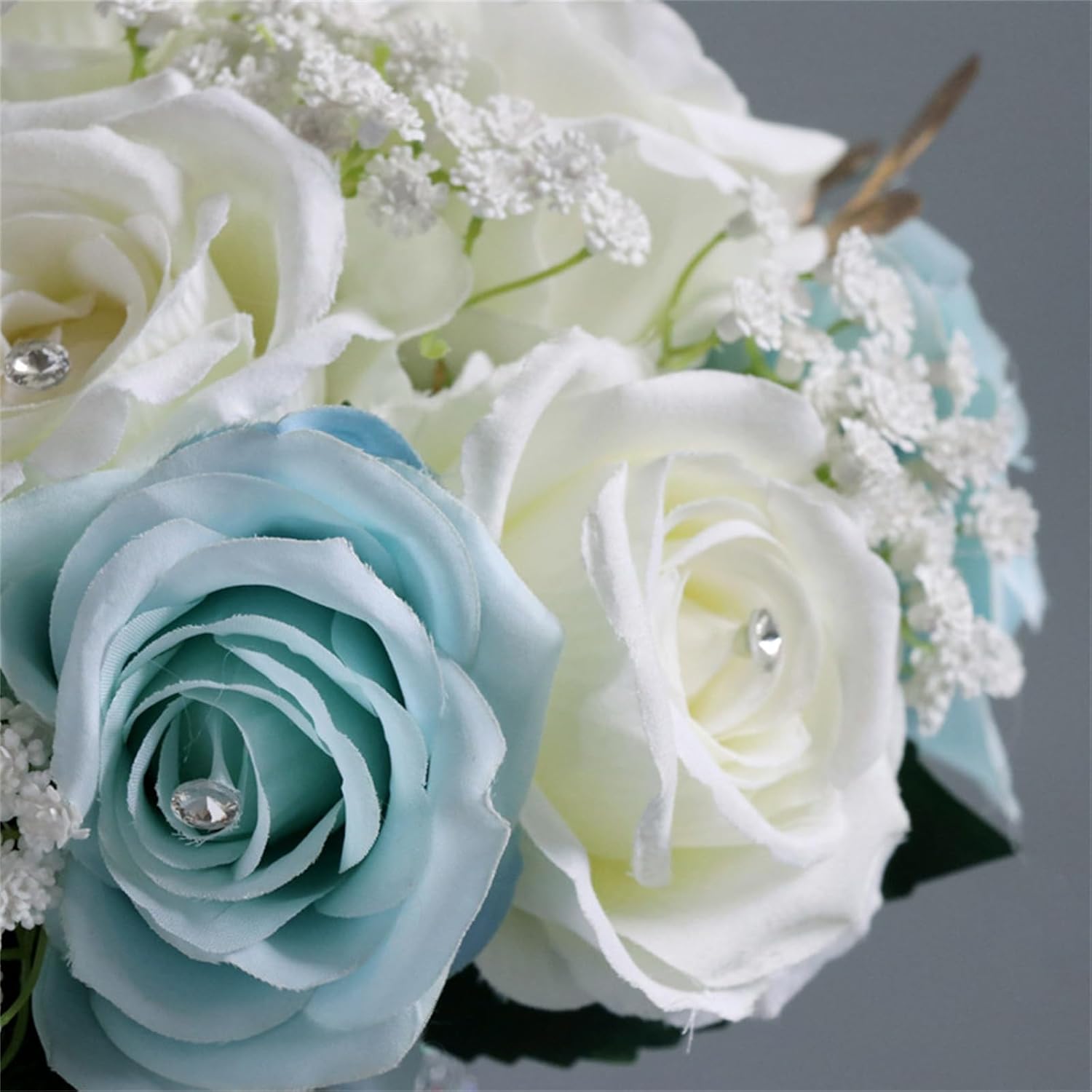 Wedding Bouquets for Bride, 9.4 Inch Artificial Silk Rose Bridal Bouquet for Tossing Bouquet Romantic Bridal Bouquet for Wedding Ceremony Anniversary (White+Blue)