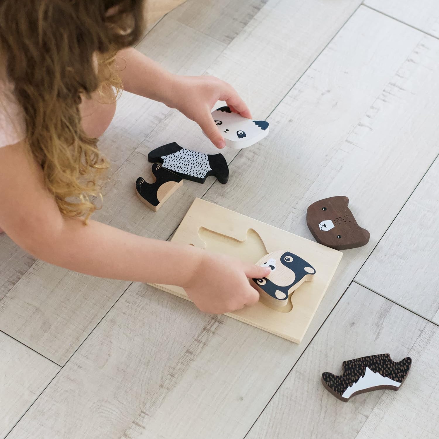 Wee Gallery's Mix and Match Animal Tiles are a modern twist on a classic dress up toy for young kids. Updated in our unique style with animal characters, these shaped blocks are sure to inspire smiles and fun. Six adorable animals with three sections that can be used to build many combinations, for a seemingly unlimited creative playtime experience. Children will work on fine motor skills and hand eye coordination too, while building with this set, which uses a tray puzzle style box instead of magnets. This set contains 18 solid wood pieces with child safe finishes and a beautiful natural wooden box for storage. A great activity for travel on the go, or play time at home, kids can develop motor skills and problem solving skills while designing their very own character combinations. This Montessori inspired toy makes a perfect gift for children ages 2 and older. Made from natural rubber wood with a child safe finish. Set includes panda, fox, cat, bulldog, brown bear, and woodland owl. With the Mix and Match Animal tiles, there is no wrong way for creative play!