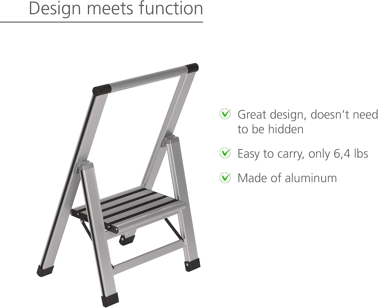 The aluminium design stepladder from WENKO with one step ensures safe standing when working at a height. Whether hanging up curtains, cleaning windows or working in the garden, the reliable ladder provides optimum stability with a height of 9.9 inch - no more unsafe balancing or wobbling. The additional safety holding grip provides a firm hold. Here, timeless attractive design is combined with the highest possible level of safety. Comfortable stepping on and off is just as guaranteed by the non-slip XXL step fluted and rubber-coated standing surface 12.5 inch x 9 inch as fatigue-free standing, even during longer periods of use. The high-quality ladder is made of rustproof, coated aluminium and non-slip plastic caps. The clever folding ladder has a 10-year guarantee and a load-bearing capacity of up to 350 lbs. This ladder can be folded up to a very flat size, ideal for space-saving storage. Due to its high-quality aluminium material, the folding stepladder is conveniently light with a weight of only about 7 lbs. When unfolded, the stepladder hat a size of W x H x D: 17.3 x 27.2 x 13 in. Depending on the body height, a working height of approximately. 80.7 inches can be reached. You have a 10-year guarantee on this product, beginning on the date of purchase. The guarantee comprises all material and manufacturing errors that impair the function. Any damage caused by improper handling or normal wear and tear is excluded. Thus guarantee does not restrict your statutory guarantee rights.