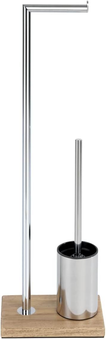 Original bathroom series in distinctive wood look – the Marla accessories are made of high-quality polyresin in wood look. The natural wood style makes every bathroom look more comfortable and harmonious. The Wenko floor set from the Marla bathroom series is a modern, elegant helper in the bathroom and guest toilet. The unusual chrome bar is worn by a high-quality, heavy base plate made of polyresin in a wood look. The flexible standing set carries the toilet paper roll at a comfortable height as well as the toilet brush in an elegant chrome insert. The included brush is equipped with a black, replaceable brush head of diameter 7.5 cm. With this practical toilet brush, the toilet can be thoroughly cleaned. The brush ensures reliable use thanks to its hard-wearing and adaptable bristles. The high-quality brush head is made of silicone. Its special non-stick effect ensures that stubborn residues and toilet paper are not stuck in the brush, but simply rinsed away when cleaning. This means that the clever brush always remains hygienically clean and cleans itself. In addition to the stand Marla toilet set, Wenko also offers the towel rack, soap dispenser and toothbrush holder as well as the soap dish. So you can get the balled nature into the bathroom or guest toilet. The Marla bathroom series is also suitable for the Pelipal® Riviera Oak furniture front. Material: frame/toilet container: steel, base plate: polyresin, colour: frame/toilet container: chrome, base plate: brown, dimensions (W x H x D): 22 x 74 x 15 cm, net weight: 1812 g.