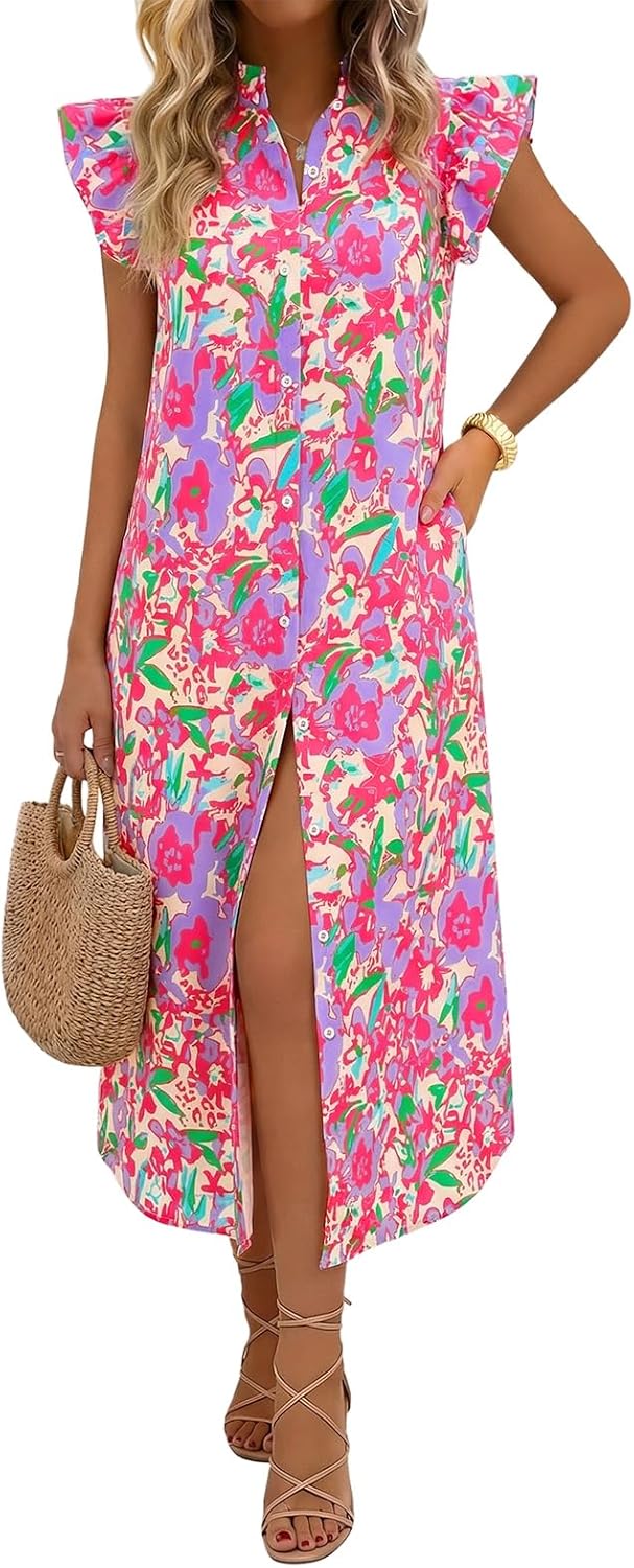 Featuring a flattering V-neck, puff short sleeves, and delicate ruffle details, this loose-fitting button-down dress combines comfort and style in perfect harmony.