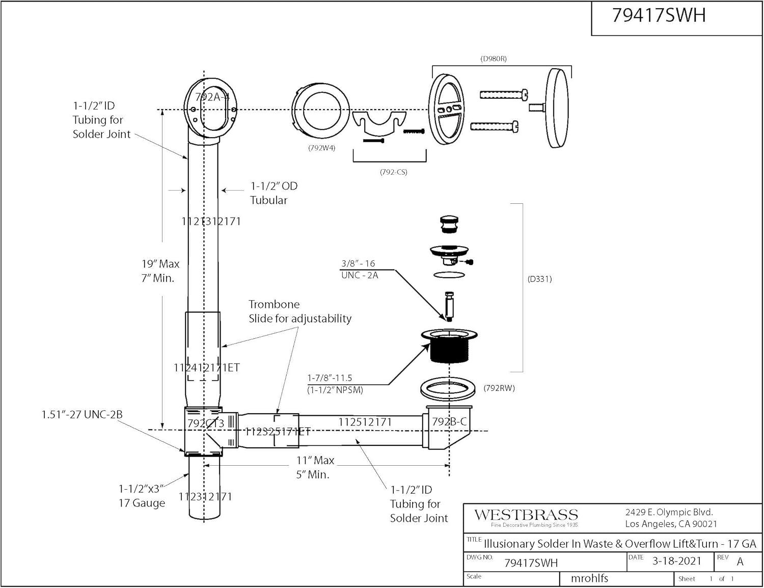This European Style Solder-In Brass Bath Waste Assembly from Westbrass is ADA approved. Requires sweating with a torch for maintenance free commercial installation. Unfinished 17 gauge heavy-duty brass metal tubes for adjustability during soldering. The assembly features a lift and turn stopper to open or close the tub drain. The illusionary overflow faceplate creates a pleasing tub trim without any screw holes. Available in a variety of stylish finishes, this item is sure to complement your existing fixtures. Be sure to check out our other model styles and VISIT OUR WESTBRASS STOREFRONT for more Kitchen and Bath items to stylize your home with convenient functionality and beauty.