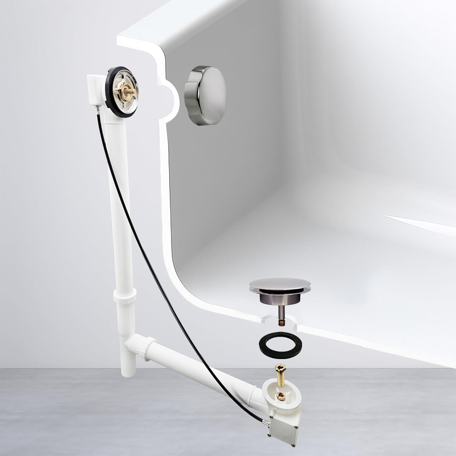 Use this cable driven bath waste and overflow assembly trim kit from Westbrass for the finishing touches to your bathtub. The polyethylene assembly with metal trim includes a standard size 1-1/2 in. pop-up stopper with strainer plate, low profile top elbow with handle mounting back plate, 35 in. cable and a round brass overflow cover knob. Rotate the knob to close the drain. Turn it in the opposite direction to open the drain. The bolt on the adjustable plunger base allows proper flow adjustment, for bathtub drainage. Do not use plumber's putty for installation use silicone seal. Available in a variety of stylish finishes, this item is sure to complement your existing fixtures. Be sure to check out our other model styles and VISIT OUR WESTBRASS STOREFRONT for more Kitchen and Bath items to stylize your home with convenient functionality and beauty.