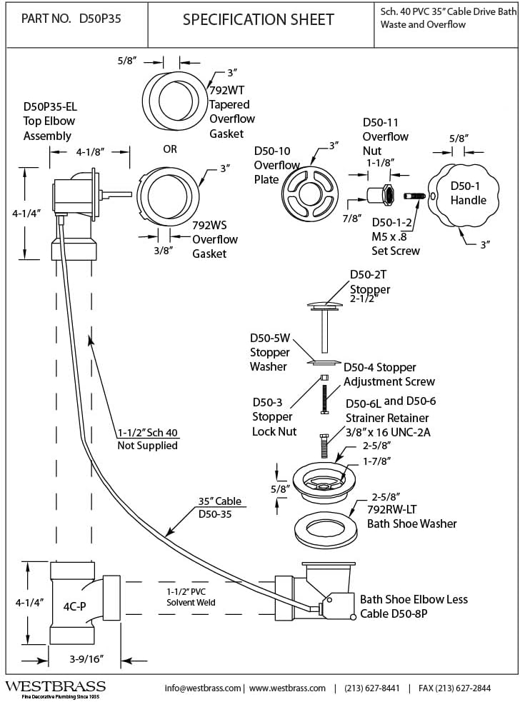Product Description Westbrass D50A35 Schedule 40 PVC Cable Drive Bath Waste with 35-Inch Cable. 1-1/2-Inch Schedule 40 PVC Cable Drive Bath Waste uses all Glue Type fittings - Tubes Not Included. Rotate overflow handle to close drain. Turn back to open. From the Manufacturer Westbrass was founded in 1935 by two brothers, Jack and Aaron Kagan, to serve the needs of all plumbing wholesalers on the West Coast. The product lines at the time included items such as faucets, valves, malleable fittings, etc. After becoming the premier distributor of plumbing products, the company was bought in 1985 by Max Homami. Seeing a boom in the Home Improvement Industry, Mr. Homami had a vision to make Westbrass the leader in Kitchen & Bath Accessories. The company currently manufactures its own products made of the highest quality materials. In order to ensure the excellence in the industry, these products are made to pass the highly stringent requirements of NSF, IAPMO, ADA and many other regulations. The Los Angeles-based company now sells a wide range of Plumbing Specialty Products, Bath Waste & Overflows, as well as Decorative Kitchen & Bath Accessories worldwide. Westbrass holds several patented items including the Deep Soak Overflow designed for extra-deep soaking in most bathing-wells, the Closing Linear overflow and several other intellectual properties. The customer base includes kitchen & bath showrooms, plumbing wholesalers and supply houses, OEM and ODM companies, as well as several national home centers.