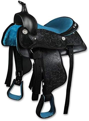 Looking for a saddle that is easy to maintain, light weight, and budget friendly? This Cardura synthetic saddle with colored crystals and accents is perfect for those that are looking for a great, lightweight trail saddle! This saddle features bright colored crystal trim along the skirting and cantle that accents the padded colored ostrich seat and horn. The saddle has colored nylon binding that ensure the saddle stays tear proof and is easy to clean. Synthetic Cardura Material Soft Padded Seat Crystal Decoration Colored Texas Star Conchos Adjustable Blevins Buckles Padded Stirrups Soft Synthetic Fleece Underside Double Reinforced Fiberglass Tree. Saddle Specifications:- Color: As per Picture. Saddle Measurements:- Seat: 10" to 12" Inches Seat Gullet: 5.5” FQHB. Skirt: 21.5-26.5” Horn: 2.5” Swell: 10” Cantle: 4.5” Stirrups: 24 – 32” Weight: Approx. 17 to 19 lbs Saddle Measurements:- Seat: 14” to 8" Inches Seat. Gullet: 7” FQHB. Skirt: 24.5-28.5” . Horn: 3.5” Swell: 12”. Cantle: 5” . Stirrups: 26 – 35”.