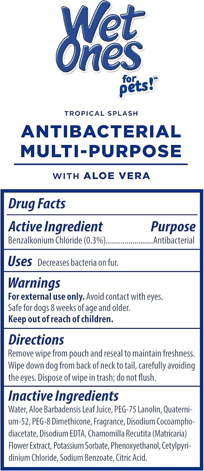 For the ones who bring their pups along, Wet Ones pairs the ideal bundle of hand wipes and pet wipes in one place! Designed with both you and your pet in mind for a quick, gentle, and healthy clean, Wet Ones and Wet Ones for Pets offer a convenient clean-up solution anytime, anywhere. This is a bulk listing that bundles Wet Ones Antibacterial Hand Wipes with Wet Ones for Pets Multi-Purpose Dog Wipes with Aloe Vera. Both sets of wipes feature Tropical Splash Scent. Each order includes 10 packages of hand wipes (20 wipes per package) and 3 cannisters of dog wipes (50 wipes per cannister). You will receive a total of 200 Wet Ones human wipes and 150 Wet Ones for Pets dog wipes. MORE INFO ABOUT HUMAN WIPES: Wet Ones Antibacterial hand wipes kill 99.99% of germs and make it easy to quickly wipe away dirt, messes and germs. Wet Ones Hand Wipes are pediatrician tested, hypoallergenic, and are paraben-free. Our Tropical Splash delights the senses with a pineapple scent leaving hands feeling clean and refreshed. Instructions: Rub on hands for 30 seconds and allow skin to dry without wiping. To dispense: Peel back front label slowly. Remove wipes. To reseal: Firmly run thumb over the label. To dispose place in wastebasket after use. Do not flush. MORE INFO ABOUT DOG WIPES: Wet Ones for Pets Multi-Purpose Dog Wipes with Aloe Vera are mild yet effective at cleaning away dirt and debris. In order to keep your dog's skin and coat healthy, nourished, and moisturized, these wipes for dogs from Wet Ones include soothing Aloe Vera for a feel-good clean everyone can enjoy. The light Tropical Splash scent left behind by these dog grooming wipes from Wet Ones for Pets will not only help combat dog odors but also leave your pet smelling their best. Safe for pets 8 weeks of age and older. Instructions: Remove wipe from cannister & reseal to maintain freshness. Wipe down dog from back of neck to tail, carefully avoiding the eyes. Dispose of wipe in trash; do not flush.