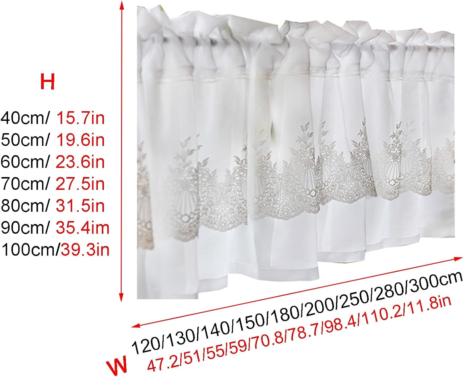 ✓ A beautiful and chic embroidered half curtain that is light and flowy, adding a stylish and romantic touch to your home and fresh glamour to your windows.✓ Features* Double gauze curtain with hollow lace on the top and pure white chiffon on the bottom.* Embroidered jacquard lace yarn, beautiful and romantic! Light and delicate, breathable and transparent.* The lace tulle fabric blocks some of the light and lets in natural light.* Perfect for use in the kitchen, dining room, bistro, cafe, bedroom, etc. A great choice to decorate your windows.* Rod-through design, using telescopic rods within 2.5 cm in diameter, it is more convenient to install without drilling;* Easy to clean, soft and skin-friendly, giving you a comfortable and healthy environment.✓ Specifications- Product Name: Embroidered yarn half curtain- Material: Lace + Chiffon- Color: White- Size (WxH): Width and height can be customized- Use place: Cabinet, small window, cupboard, interior door.- Care instructions: Gentle machine wash or hand wash in cold water, do not bleach.- The package includes: 1 short curtain (not including the rod)✓ Tips- The size is measured by hand, there may be 1-3 cm error.- For proper padding, the panel should be 1.5 to 2.5 times the width of your window (Example: if you have a 100cm wide window, we suggest you buy 150 - 200cm.)- Due to the condition of the monitor, the color of the picture and the actual product may differ. Please understand this beforehand.