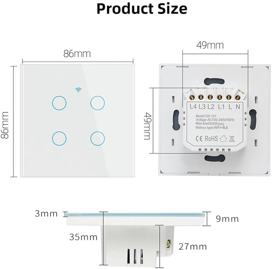 1.App Remote Control:As long as your smart phone or tablet has 4G or WIFI network, you can control your lights by the App "Tuya smart or Smart Life".2.Voice control:Perfectly Compatible with Alexa and Work with Goge Home. Turn on/off lights with voice commands when your hands are full.3.Timer Setting:Setting a schedule or timer on/off your lights on night and morning, and then your will never go back to a dark house when you go back home at dusk. Moreover, you could quietly waked up by scheduled light on every morning.4.Share Function:Sharing devices with your family members to eliminate extra steps for connection.5.Smart Scene:Creating your own scene to trigger ON/OFF home appliances by departure mode, home mode, temperature, humidity, or other environmental conditions.6.Safety and Certification:The wall switch adopts premium materials, such as fire-resistant shell, phosphor bronze connects and advanced PC+TEMPERED GLASS, can provide fire prevention, overload protection to protect your family.7.Our all products certificated by CE, FCC, and RoHS. Without using any harmful chemical substances, please fell relived about usage.Color: White/BlackMaterial: PC+ Toughened Glass PanelVoltage: 100-250V 50/60HzCurrent: 10ARated Load: 5-600W/GangPower Consumption: ≤0.5WWorking Temperature: 0℃~40℃WIFI Standard: IEEE 802.11bgn 2.4GhzSupport System: Above iOS 8.0 or Android 4.3Hub Requirement: NoNetwork Security: WPA/WPA2"Control Mode: APP/ManualCertification: CE, RoHSAPP: Tuya Smart/Smart Life