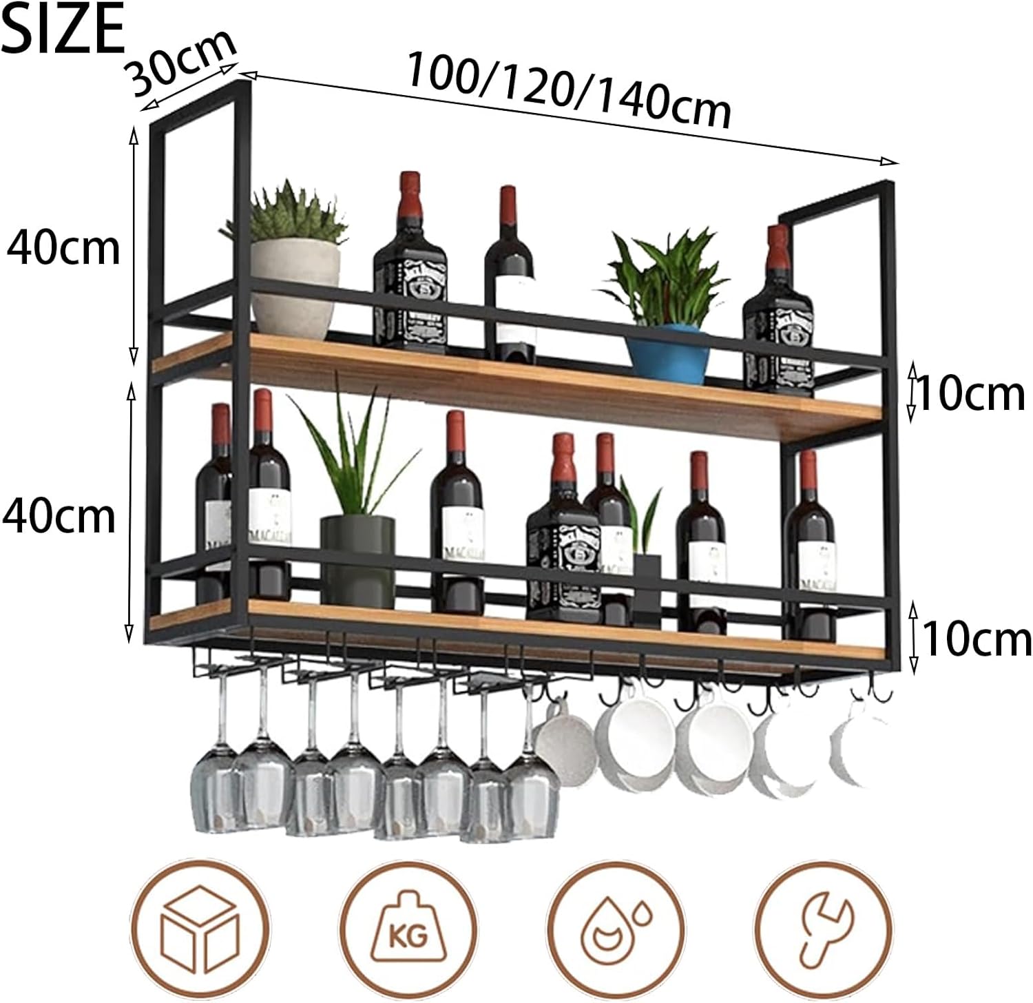 Hanging , Double Metal with Tall Glass Holder, Ceiling Bar Hanging Shelf, Storage Rack for Bar Kitchen Cafe