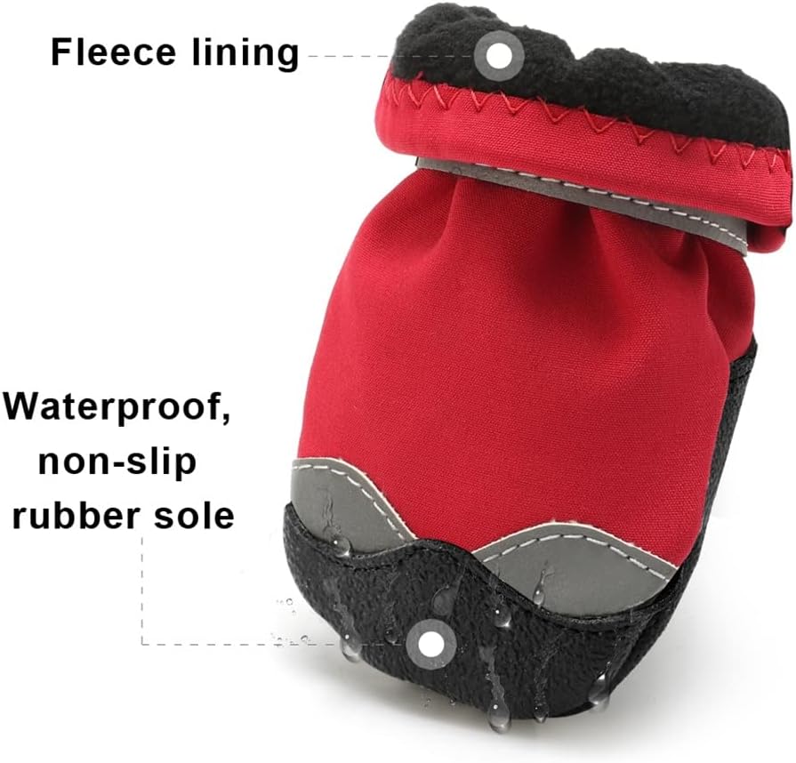 Features: Winter Dog Shoes Warm Pet Dog Boots Waterproof Puppy Dog Rain Snow Booties Socks Reflective For Small Large Dog Footwear Outdoor. Protect your dog's paw from muddy or heat ground, washable and reusable. Super soft and comfy inside lining. This boot is designed for medium large dogs, good for indoor or outdoor use. Very thick and warm, quite fit for cold winter. Material: 100% Cotton Type: Dogs Color: Black/Red Type: Dog Shoes boots Feature: Keep warm, waterproof, reflective,Non-slip,Thick Season: Autumn/Winter Occasion: snow rain dog shoes Packing list: 4 * pet socks The puppy rubber boots could keep pet paws snug and secure.