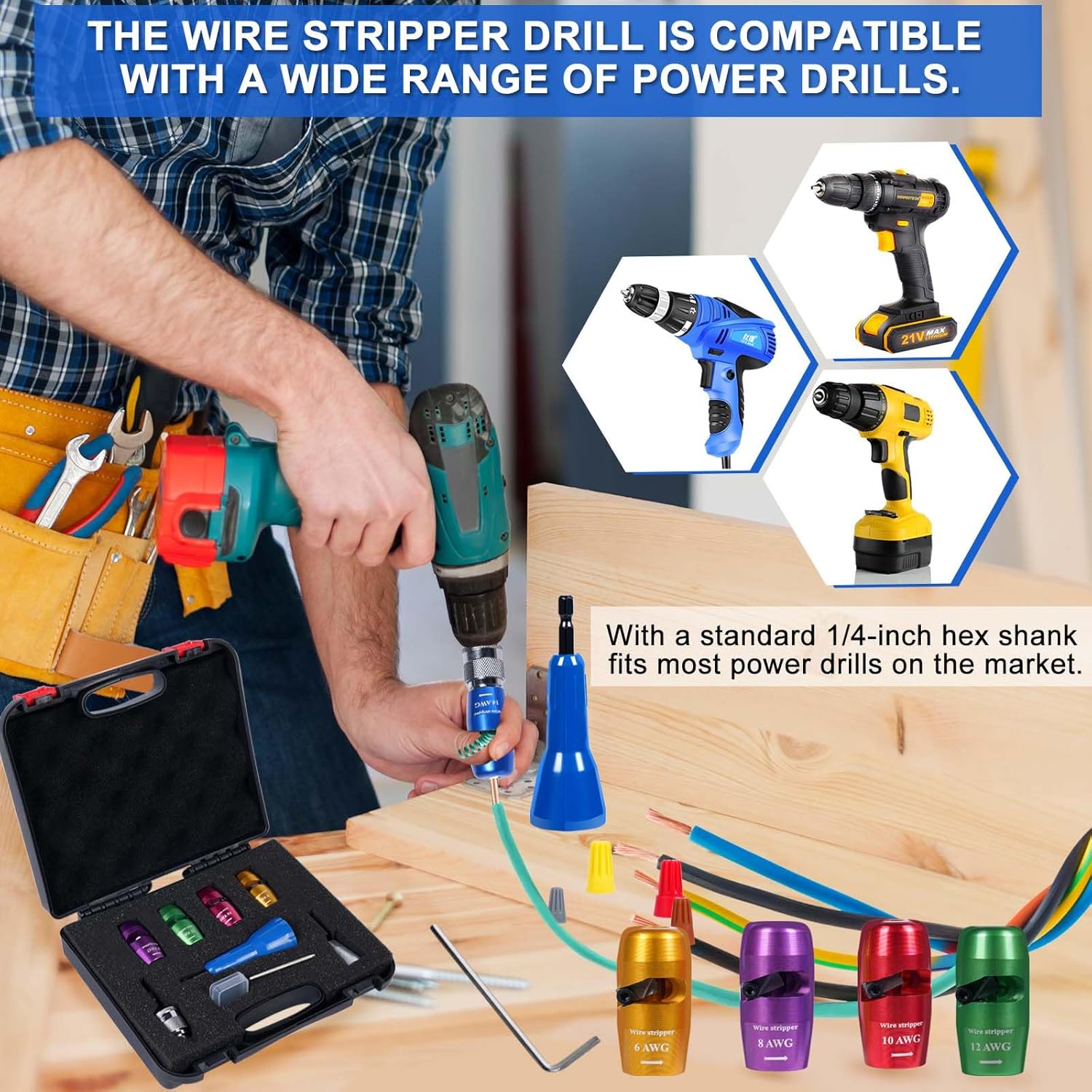 FEATURES:1.Cleverly designed and versatile, this AWG wire stripper tool set is perfect for a variety of applications, from quick wire stripping to precision twisting. The wire stripper attaches easily to a power drill for quick and easy wire stripping and twisting, saving you time and energy2.The wire strippers work astonishingly well. Strips quickly and cleanly with no damage to the wire3.The wire nut twister further simplifies the task, making it easier to achieve tight and secure connections4.For a DIY enthusiast, it will did a fine job on allSPECIFICITIES:Material: Aluminum, Alloy Steel, MetalModel: 4pcsPACKAGE INCLUDES:4 *AWG Wire Stripper2 * Twisting Tool1 * L-shaped hexagonal wrench1 * Replacement Blade25 * wire caps1 * Instruction sheet1 * Tool box