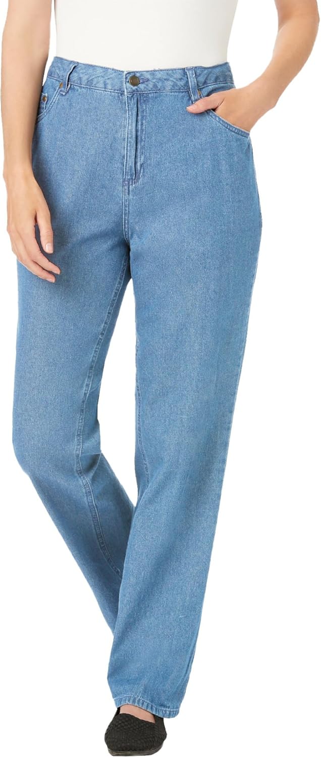 These straight-leg five-pocket jeans provide a perfectly relaxed fit that you'll feel great in all day long. This non-stretch classic is 100% cotton; it gives you a custom-feeling fit and softens as you wash and wear them. Get casual comfort with a laidback look and feel that's great for everyday wear. Classic cotton denim jeans – perfect for any season. br> Relaxed fit for ultimate comfort. br> Full through the hips and legs for a flattering silhouette. br> Easy button and zipper fly for secure closure. br> Sits comfortably at the waist. br> Available in Average (30" inseam), Petite (28" inseam), and Tall (34" inseam) to suit your height perfectly. br> 100% cotton for breathable, long-lasting quality. br> Easy to care for – machine washable. br> Imported.