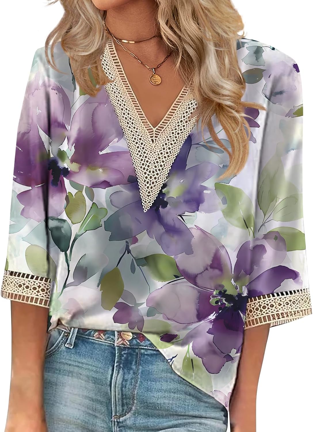 Nexavio Women Floral Printed Tshirts 2025 V Neck 3/4 Length Sleeve Shirts Tee Casual Basics Summer Fashion Tops