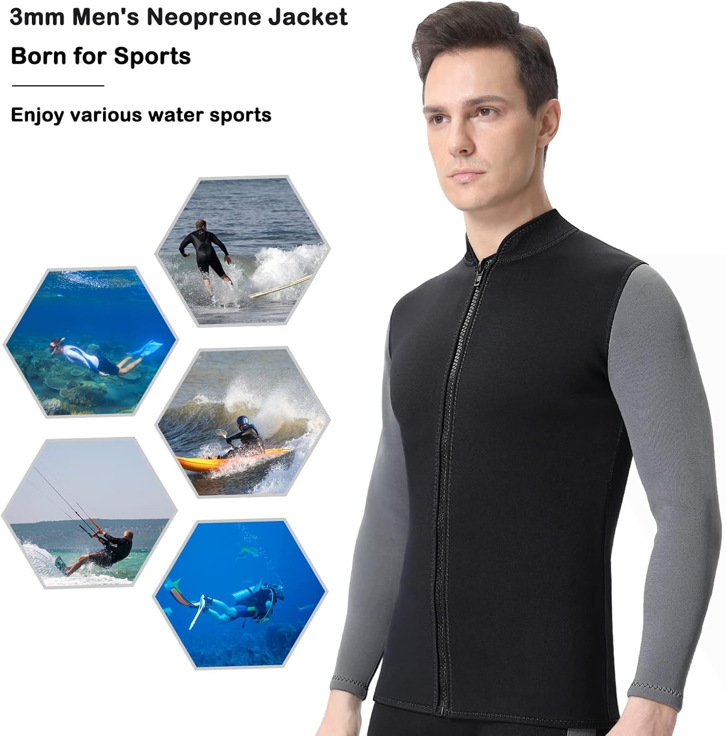 • Buoyancy: Strechy neoprene jacket wetsuit's buoyancy feature helps you stay afloat in the water,the wetsuit top jacket can be be worn alone as a springsuit in warm weather and over a full wetsuit or lycra skin for added warmth in cold weather