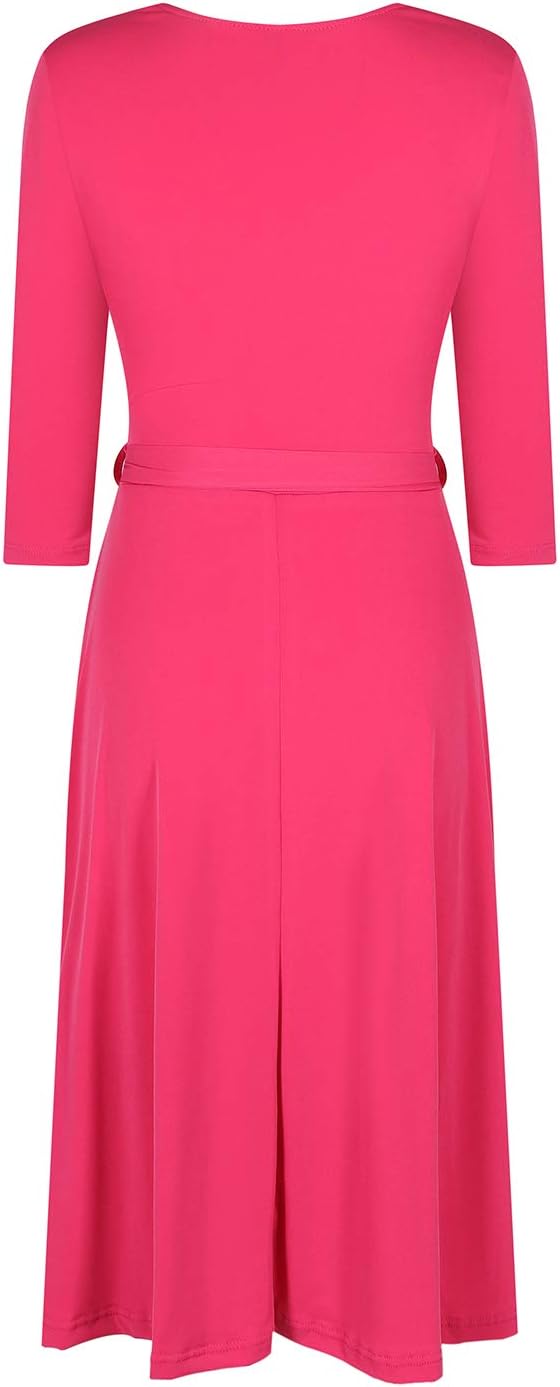 This sleek and sexy knee length wrap dress is a must have! This gorgeous wrap dress features a v-neck line, 3/4 sleeves, and ties around the waist making it flattering for all body types. This dress can be effortlessly dressed up or down. Perfect for a work, traveling, vacation, bridal/baby showers, weddings, party, date, or other events. The stretch and comfort of the dress also makes it perfect for stylish maternity wear! Pair it with heels, a clutch, and statement necklace for a more formal look or with sandals and a sunhat for a relaxed spring or summer outfit. However you wear it you will look great and feel comfortable from day to night.