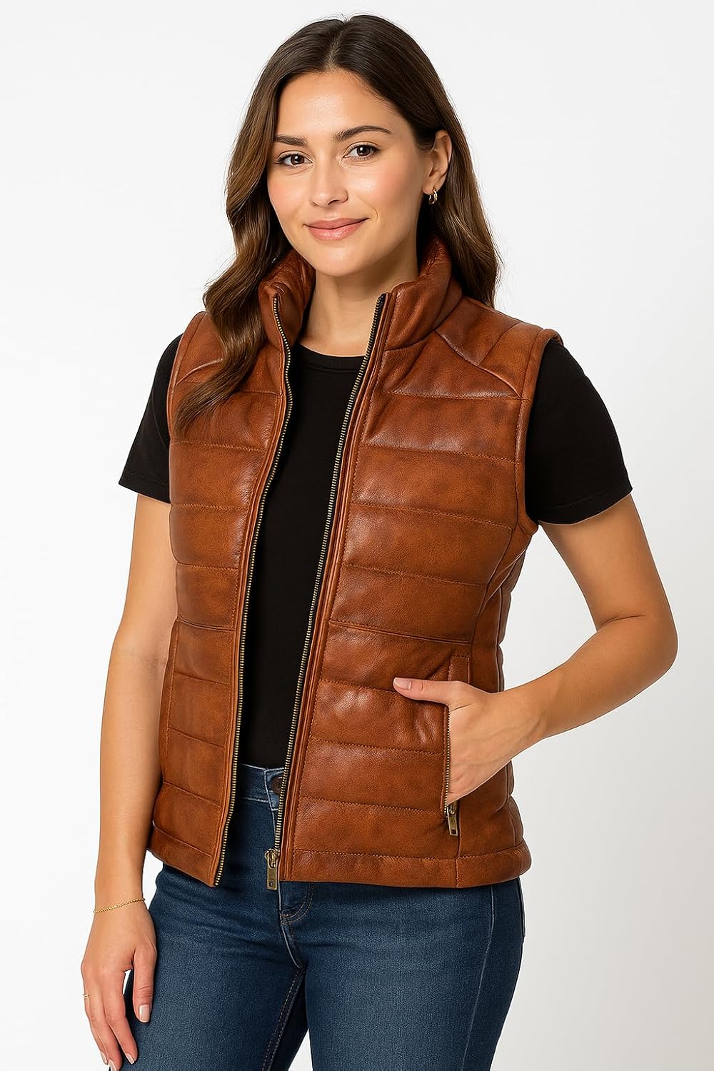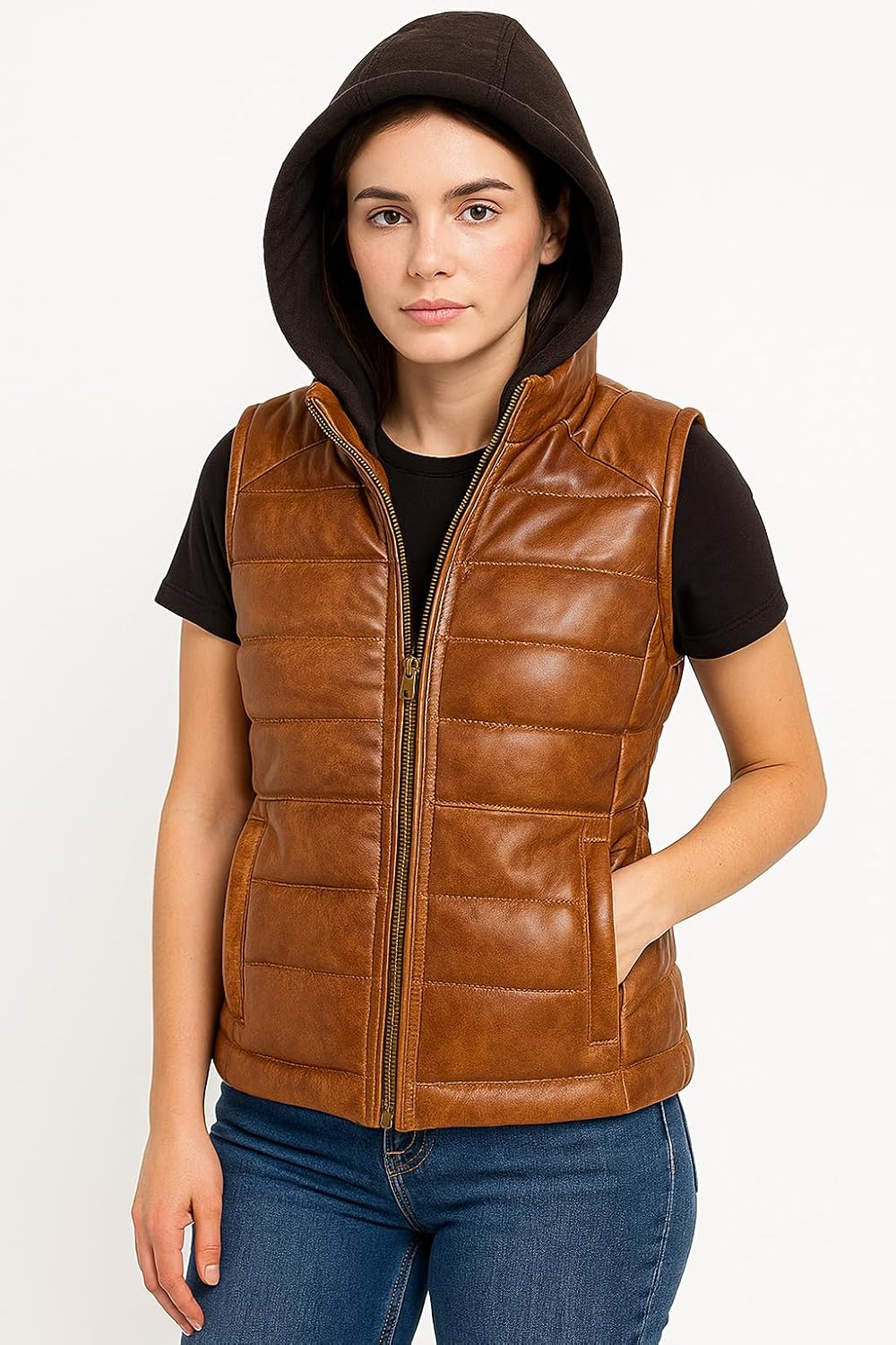 Upgrade your wardrobe with the RABCHI Women’s Distressed Cognac Brown Leather Puffer Vest with Detachable Hood, designed for timeless style and modern versatility. Made from 100% genuine lambskin leather, this sleeveless quilted vest offers warmth and sophistication in every detail. The distressed cognac finish with amber undertones and burnished edges adds vintage character, while the horizontal puff quilting and triangular padded shoulders give structure and dimension. A detachable black fleece hood allows you to switch between a sleek urban look and cozy casual styling. Functional details include a high stand collar, two-way antique-brass zipper, welt pockets, and dark-brown lining for comfort. Finished with the authentic RABCHI tag in silver on black, this vest is a statement piece perfect for layering over tees, sweaters, or dresses across all seasons.