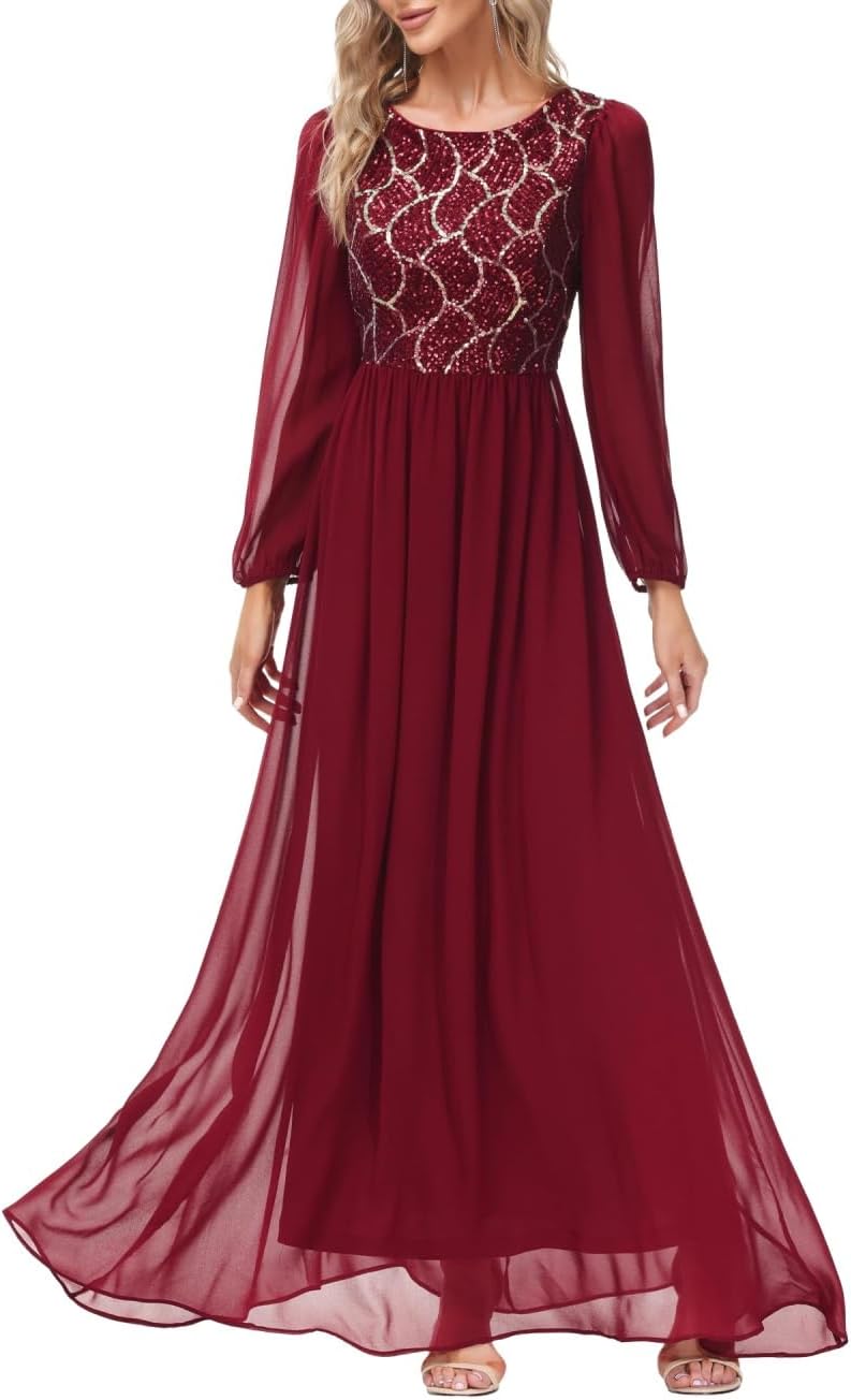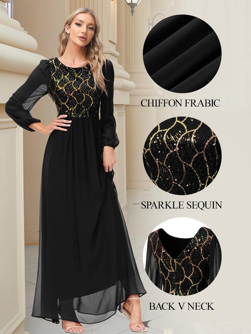• Features:maxi length,sequin chiffon fabric,crew neck,a line,empire waist,long sleeves,mother of the bride,elegant bridesmaid dress,wedding guest dress,cocktail party dress,formal prom dress