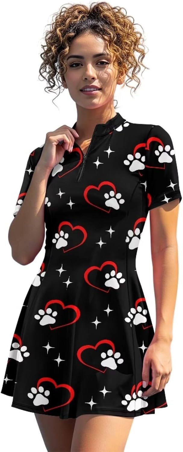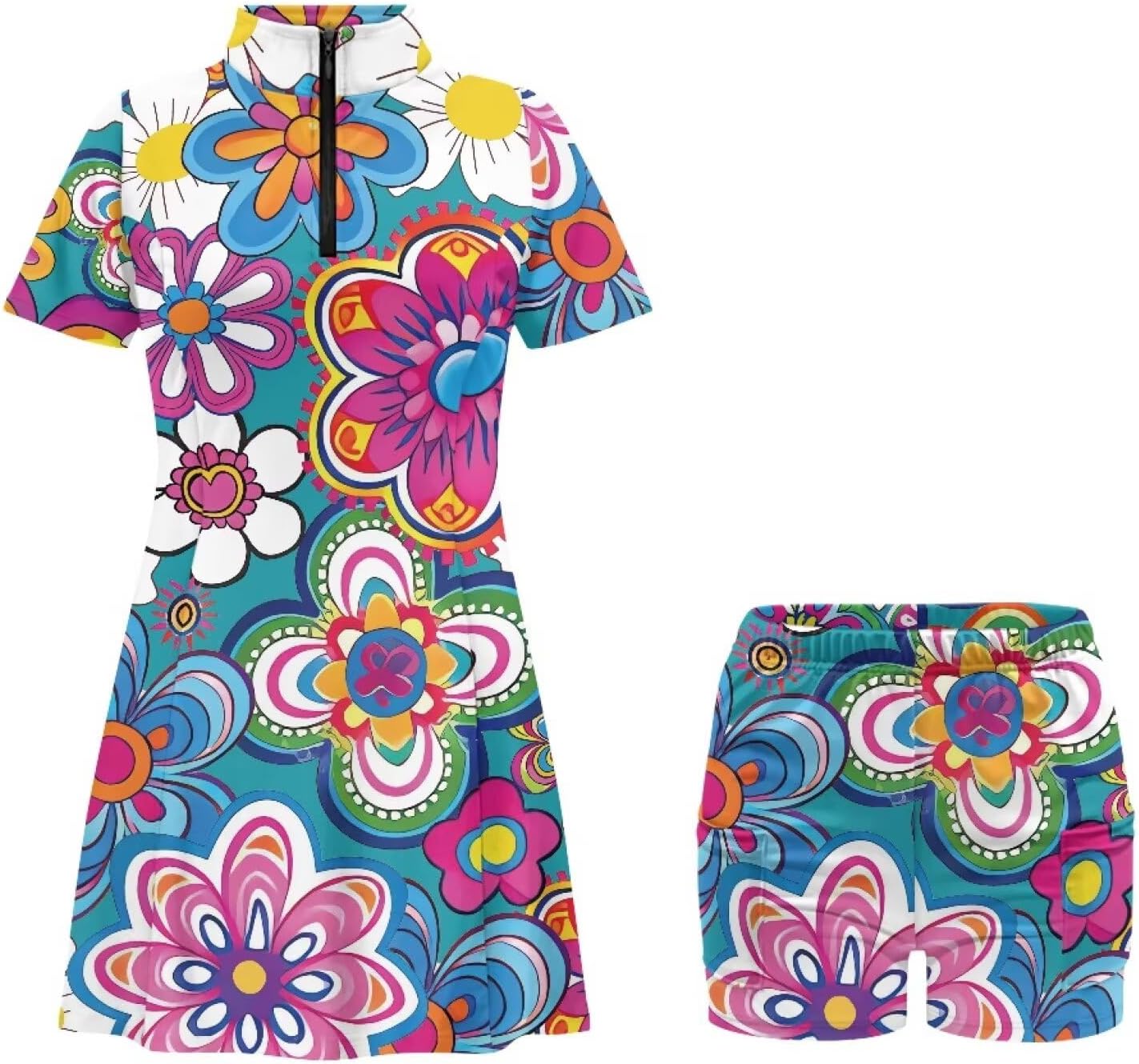 Spowatriy Womens Golf Tennis Dress Set with Shorts and Pockets: -Made of 95% polyester and 5% spandex fabric,soft and lightweight, skin-friendly and moisture wicking,not easy to fade,comfortable and breathable. -Short sleeve tennis dress with built-in shorts pocket,elastic waist, A-line hem, Athletic dresses Women's golf clothing set ideal for golf, tennis, cycling, running, hiking, camping, biking, yoga, daily wearing,etc.The golf set can also be worn alone, casual and fashionable Size : 6 sizes for you to choose:XS/S/M/L/XL/2XL. -With various different colors fun printed patterns for you to choose, making you more confident and charming in the game! Flattering Fit Tailored yet relaxed silhouette complements all body types Short sleeves dresses with inner shorts provide coverage without restricting movement