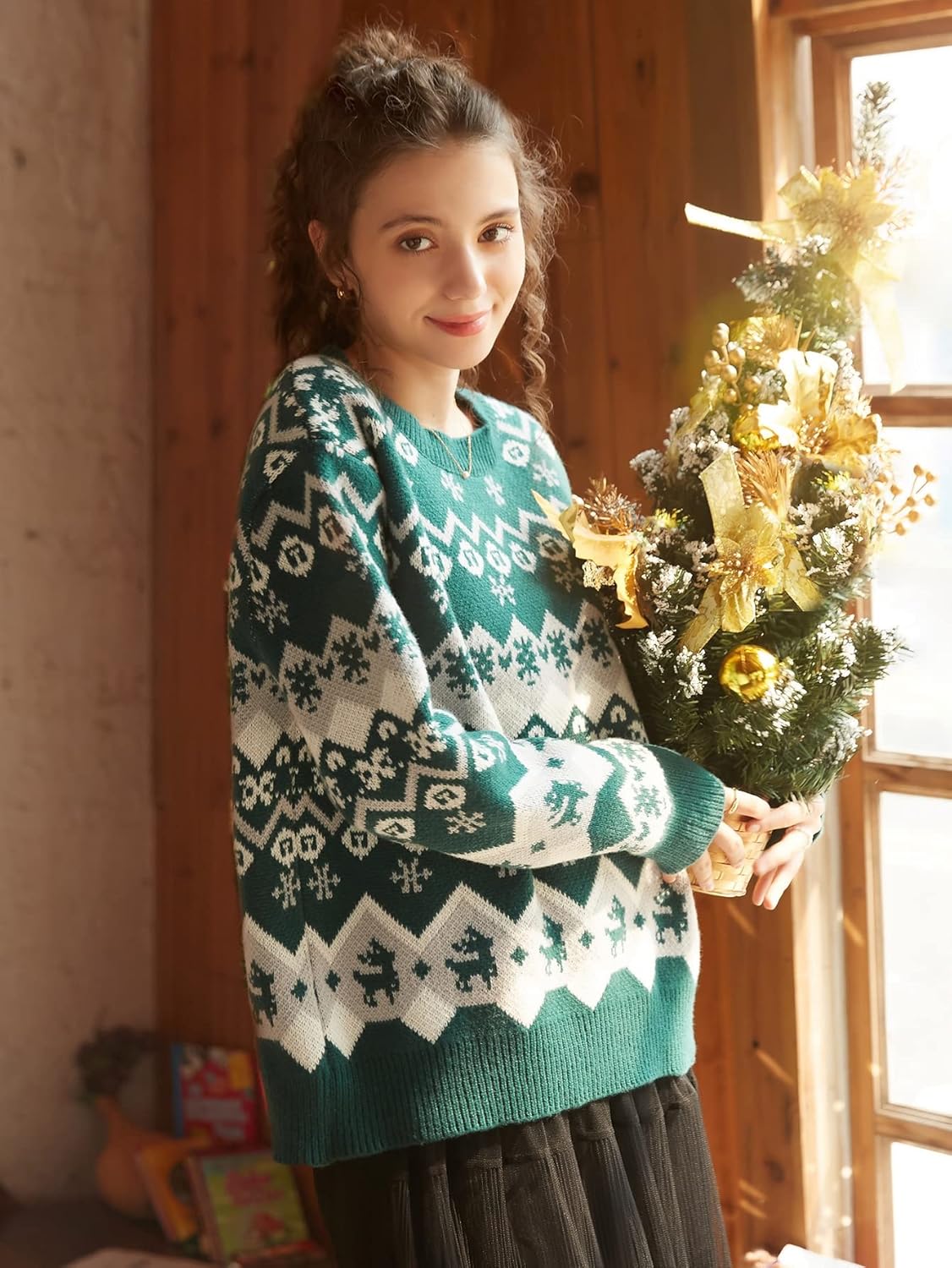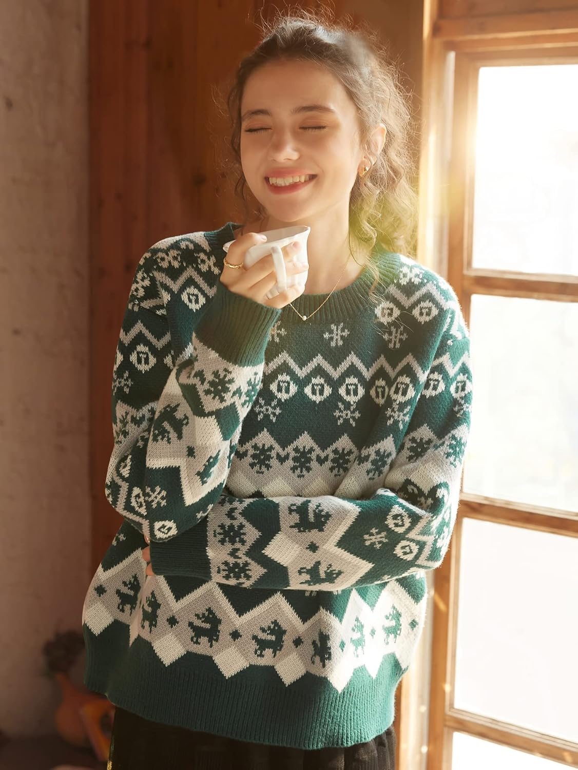 SBust : 43.3 inchLength : 23.6 inchShoulder : 17.5 inchSleeve Length : 21.7 inchMBust : 44.9 inchLength : 24.4 inchShoulder : 17.9 inchSleeve Length : 22 inchLBust : 46.5 inchLength : 25.2 inchShoulder : 18.3 inchSleeve Length : 22.4 inchColor: MulticolorStyle: CasualPattern Type: Christmas,GeometricType: PulloversLength: RegularNeckline: Round NeckSleeve Length: Long SleeveSleeve Type: Drop ShoulderFit Type: Regular FitFabric: Slight StretchMaterial: FabricComposition: 55% Viscose,27% Polyester,18% NylonCare Instructions: Machine wash or professional dry cleanSheer: No