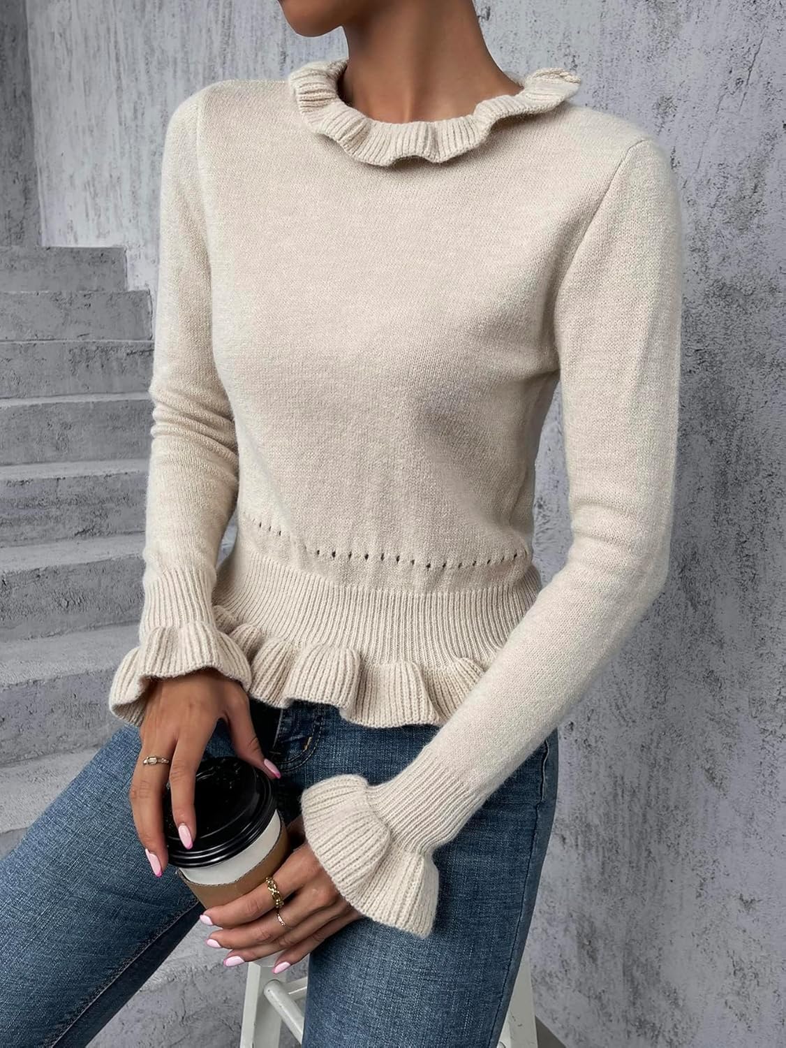 SBust : 34.6 inchCuff : 11 inchLength : 21.3 inchShoulder : 15 inchSleeve Length : 24.4 inchMBust : 36.2 inchCuff : 11.4 inchLength : 22 inchShoulder : 15.7 inchSleeve Length : 24.8 inchLBust : 38.6 inchCuff : 11.8 inchLength : 22.8 inchShoulder : 16.5 inchSleeve Length : 25.2 inchColor: BeigeStyle: CasualPattern Type: PlainDetails: Ruffle,Frill,Ruffle HemType: PulloversNeckline: Round NeckSleeve Length: Long SleeveSleeve Type: Flounce SleeveHem Shaped: FlaredLength: RegularFit Type: Regular FitFabric: Slight StretchMaterial: AcrylicComposition: 45% Acrylic,29% Polyester,26% ViscoseCare Instructions: Machine wash or professional dry cleanSheer: No