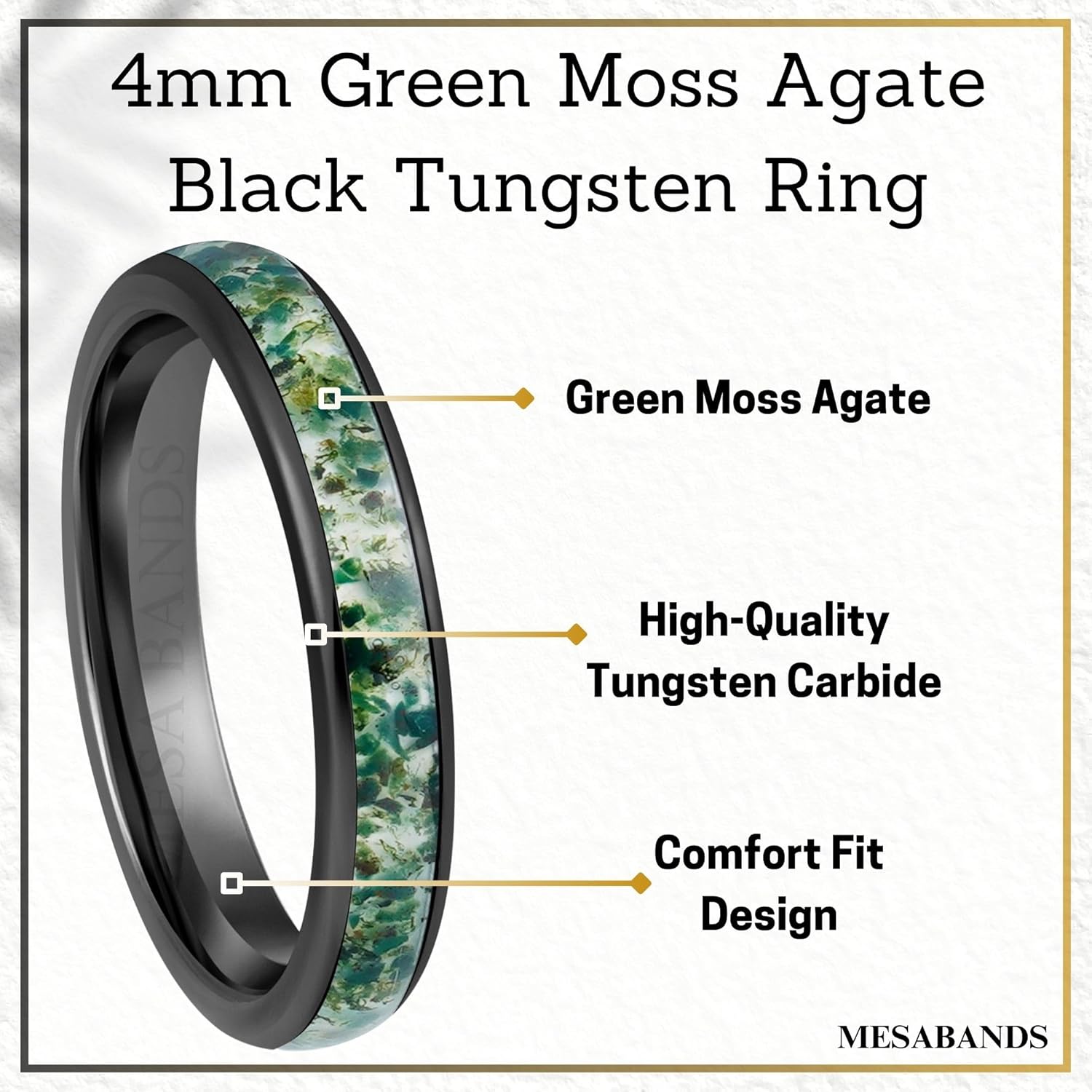 This women’s wedding band features a sleek black tungsten design with a genuine moss agate inlay—symbolizing growth, balance, and a deep connection to nature. At 4mm wide, this comfort-fit ring offers understated elegance with lasting meaning, beautifully presented in an antique wooden ring box.