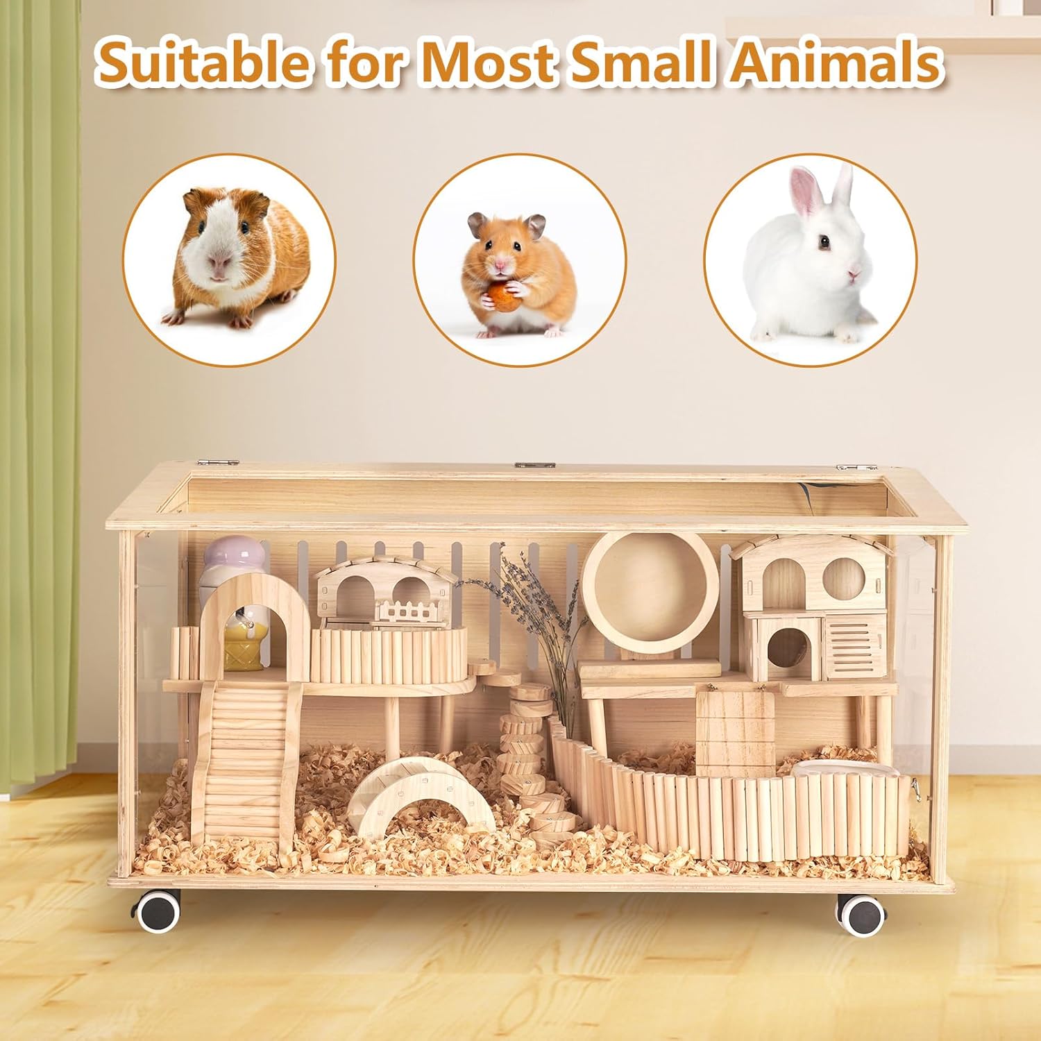 Premium Materials: Crafted from high-quality pine wood and reinforced acrylic panels, this wooden hamster cage boasts exquisite craftsmanship, exceptional durability, and a sturdy structure, effectively preventing accidental ingestion by your pet Easy Assembly: Detailed assembly instructions are included, allowing you to effortlessly build a clean and refreshing home for your hamster. Please note: Decorations shown in images are not included Spacious Cage: The generous interior comfortably accommodates wooden tunnels, bridges, exercise wheels, and other toys/accessories. Large acrylic panels provide clear viewing from multiple angles