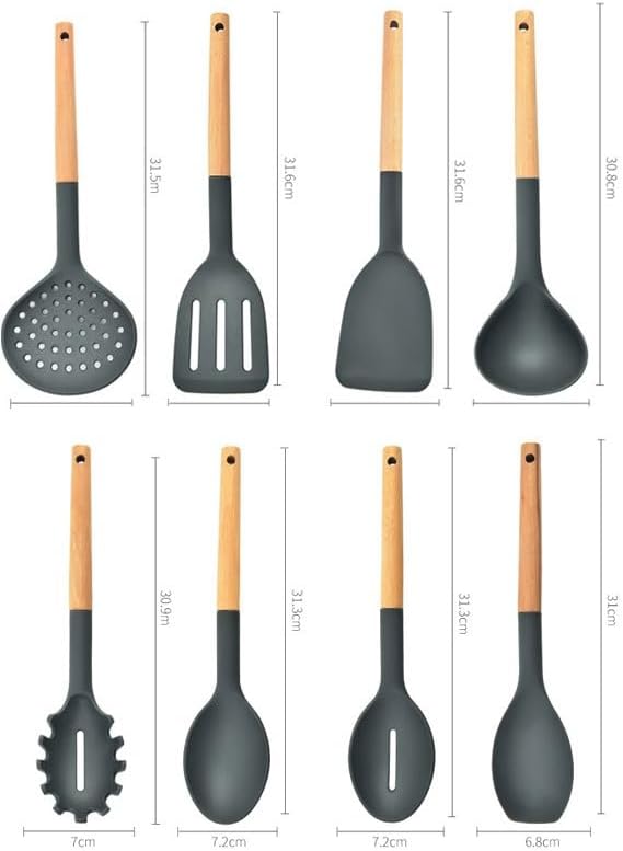 Product Name: Spoon and spatula setMaterial: Silicone,woodSize: As shownColor: As shownFunctions: Cooking, bakingThe set includes: Frying spatula, soup spoon, ladle, salad spoon, etcCrossbody bag:Shovel and spoon set *1 set(Excluding display items)Attention:1. Due to manual measurement, please allow 1-2cm error. Please understand,Thank you2. The actual color of the product may be slightly different from the color shown in the picture. please refer to the actual product