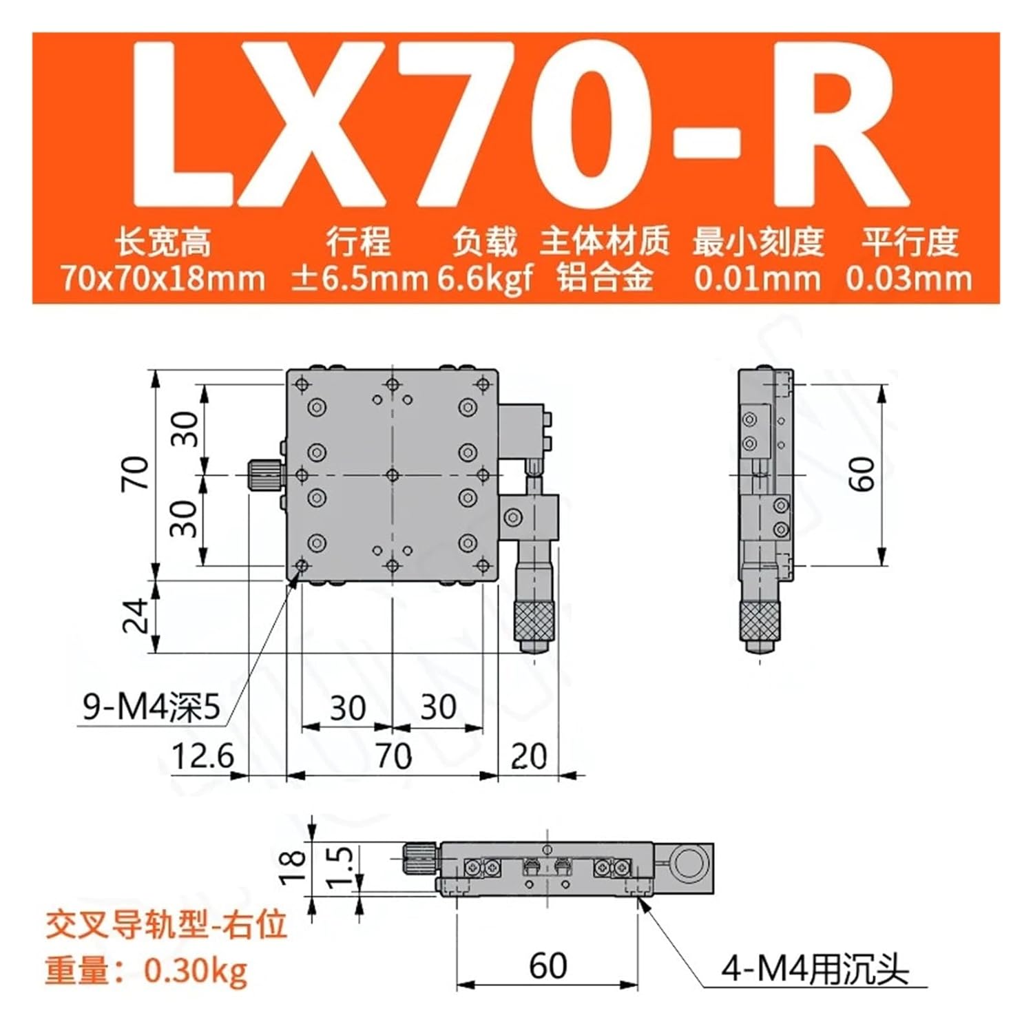 X-axis high-Precision 70 * 70mm Optical Manual Displacement Platform Guide Micrometer(LX70-R)