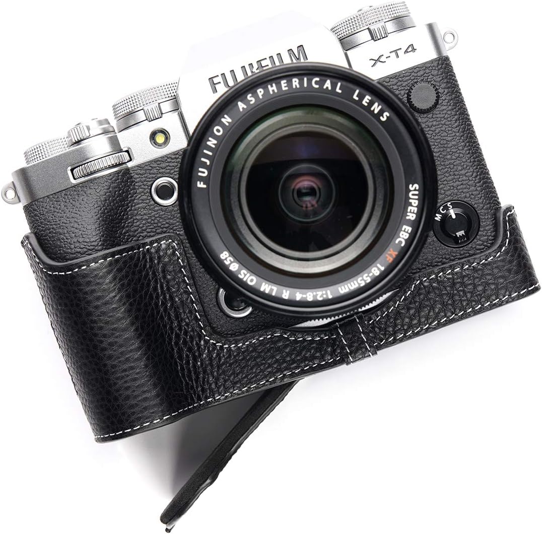 This camera is made by real top layer oil leather, the design is simple and vintage, use Metal sizing techniques make it very fit with the camera body. Inside lining use high lever velvet to protect camera body for scratch and coloration. There is a opening on the bottom for battery, You don't need to take off the half case when you change battery. Under base screw is made by copper and it can easy take off by coin. You don't need to take off the half case when you use tripod. It has a special design for Fujifilm Fuji X-T4 XT4 Camera which makes it easy to turn over the Screen and it will totally not affect screen rotation. You don't need to take off the half case when you connect data lines. Content: 1 x camera half case, 1 x Free Genuine Real Leather Hand Strap, camera not included. Material:Genuine leather.