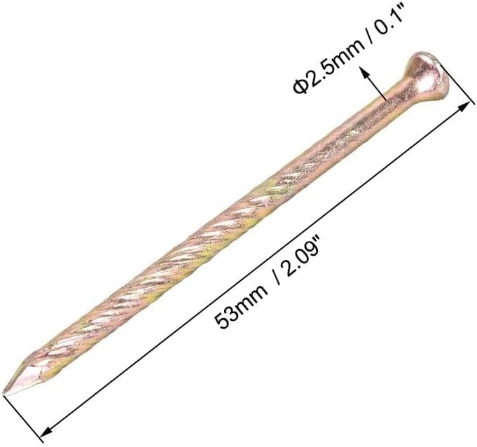 Description: Suitable for hanging or holding charts, banners, calendars, etc. Widely used on walls, floors, wood plates in houses, garages, factories, offices, etc. chemicals to clean nail heads, be careful when hammering wood floors. Specification: Material: Carbon Steel Surface Treatment: Zinc Plated Total length: 53 mm / 2.09 inches. Shank diameter: 2.5 mm / 0.1 inches. Head diameter: 4 mm / 0.16 inches. Package Content:120(+/- 5%) pcs x Spiral Platform Nails