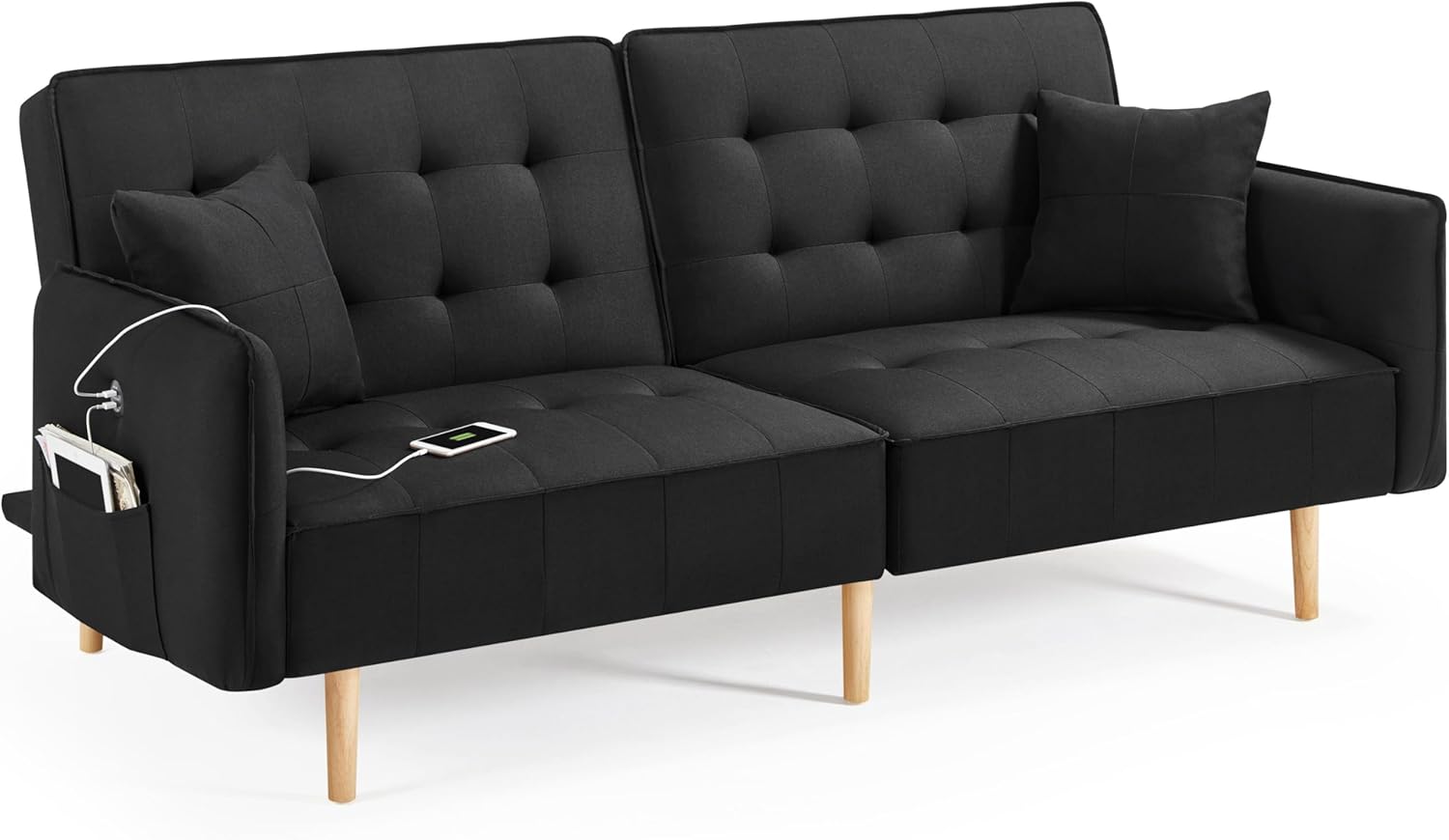 Convertible Futon Sofa Bed Memory Foam Couch Sleeper Linen Fabric Tufted Split-back Daybed for Studio, Office, Dorm, Apartment, Living Room, Guest Room w/2 PillowsQuick Overview:A convertible futon sofa bed has the advantage of being able to function as both a sofa and a bed. This futon bed is designed to meet your expectations of saving money and space while maintaining a modern and attractive aesthetic, so you won't have to sacrifice quality or comfort for affordability. The futon's convertible design allows it to be turned into three different angles to serve as a couch, lounger, or sleeper bed for unexpected overnight guests. This futon sofa, made of robust wood tapered legs and high-resilient memory foam with delicate linen fabric upholstery, provides sufficient support and comfort while remaining durable for long-term use. The two throw pillows support your head or back and make sitting and lying more comfortable. This couch bed has a side pocket to store your daily essentials and a USB port for easy phone charging for your convenience. Simple assembly is required.Side Pocket Size: 34.6cm L x 20cm W/ 13.6" L x 7.9" WMaterial: polyester filling and sponge, linen, solid wood, engineered woodOverall Dimension:Sofa back tilts at 105°: 198.5cm L x 93cm W x 83cm H/ 78” L x 37” W x 33” HSofa back tilts at 140°: 198.5cm L x 103cm W x 67.5cm H/ 78” L x 41” W x 27” HSofa back lays flat (with arms): 198.5cm L x 112cm W x 64cm H/ 78” L x 44” W x 25.5” HNet weight (assembled product weight): 41.5 kg / 91.5 lbGross weight (product in the box): 46.6 kg / 102.7 lb