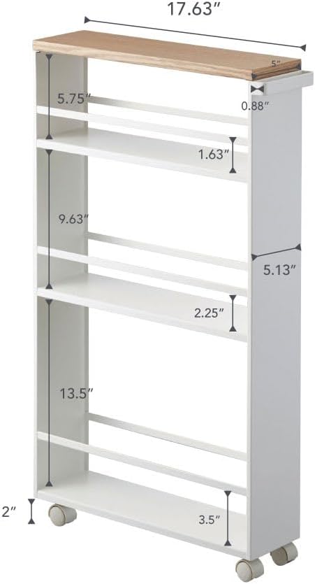 Meet the cart that redefines narrow kitchen storage. This slim rolling cart from Yamazaki Home is more than functional furniture – it’s a storage super-star, celebrated for transforming tight spaces into high-capacity, high-performance storage. Inspired by life in Japan, the cart features a slender steel frame, a refined wooden top, and three cleverly designed shelves to store everything from cooking oils to cleaning supplies. The reversible handle and smooth-rolling casters make it easy to maneuver, perfect for fitting between kitchen appliances like the counter and refrigerator. Designed to roll into spaces where others can’t, the cart measures 18.7" L x 5.1" W x 31.7" H and weighs just under 9 lbs – slim enough to tuck beside refrigerators, between cabinets, or next to the washing machine. And when it arrives? Setup is refreshingly simple. With minimal assembly required, you’ll have this bathroom cart on wheels ready to roll in minutes – no stress, no fuss. Impeccably designed. Extraordinarily useful. Whether you call it a slim shelf for the kitchen storage cabinet, a home cart organizer, extra bathroom storage, or simply that award-winning narrow cart, it brings clarity, calm, and clever utility to any home. Yamazaki Home – Home, simplified.