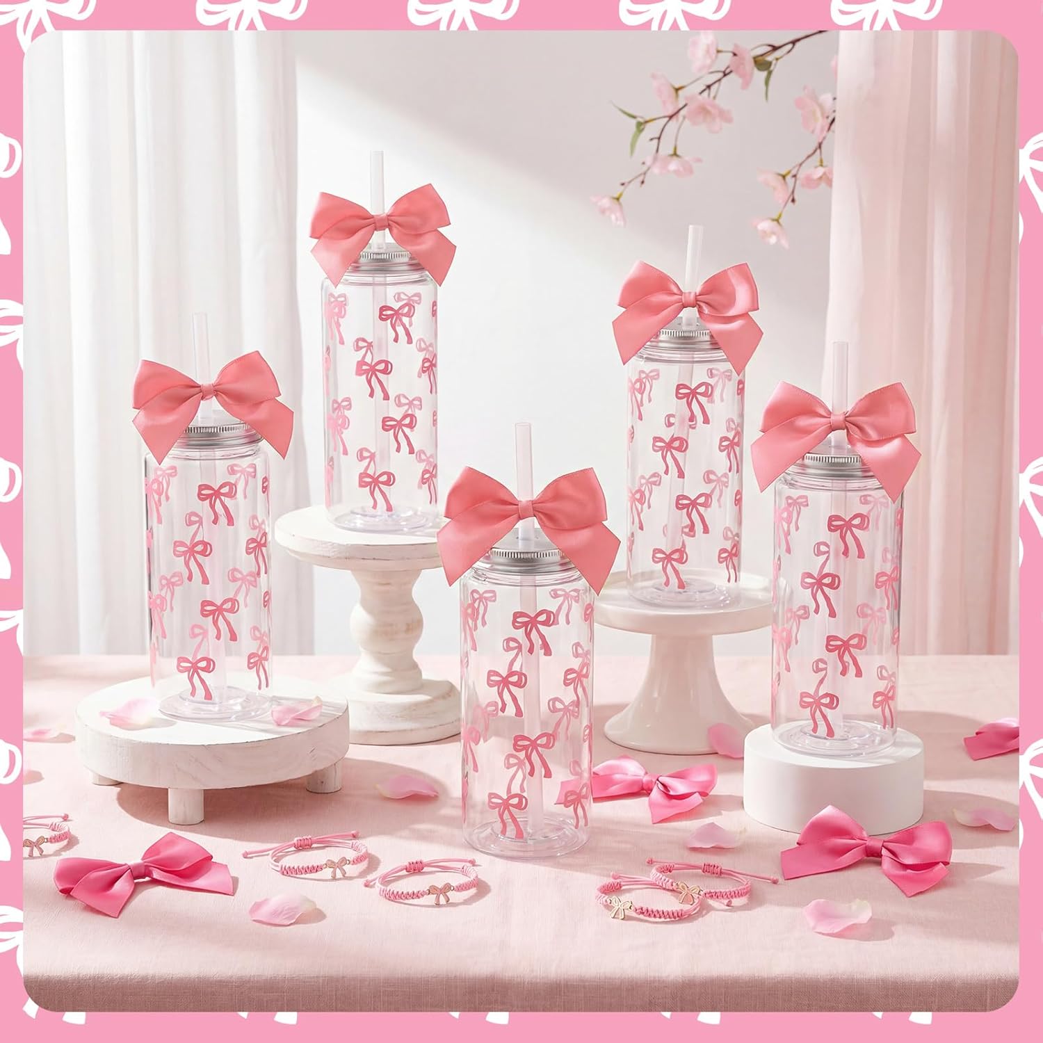 Features: DIY as you like: You can combine our pink bow cups with other decorative items, such as stickers, making your decorations look more charming. Elegant appearance: Our pink bow cups are elegant and eye catching, impressing your guests, and it makes a lovely decoration for your company as well. Specifications: Material: plastic Color: pink Size: Bow cups: about 14.2 oz Bow bracelet: about 7–11 inches Package includes: 12 x Bow cups 12 x Bracelets with pink bow 12 x Pink bows Notes: Manual measurement, please allow slight errors on size. The color may exist a slight difference due to different screen displays