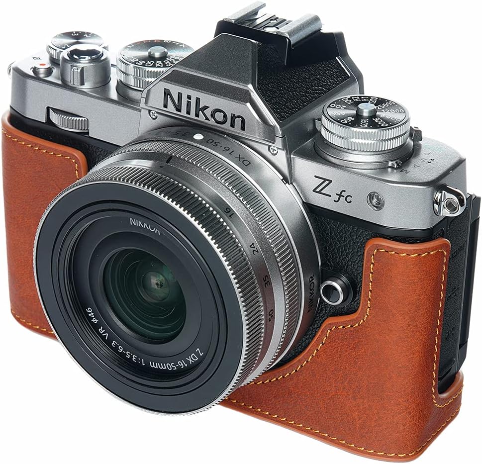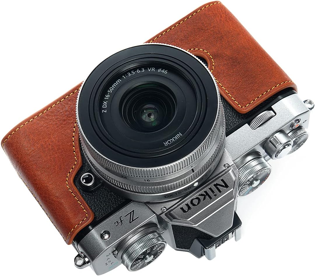 This camera is made by real top layer oil leather, the design is simple and vintage, use Metal sizing techniques make it very fit with the camera body. Inside lining use high lever velvet to protect camera body for scratch and coloration. There is a opening on the bottom for battery, You don't need to take off the half case when you change battery. Under base screw is made by copper and it can easy take off by coin. You don't need to take off the half case when you use tripod. It has a special design for Nikon Z fc Zfc Camera which makes it easy to turn over the Screen and it will totally not affect screen rotation. You don't need to take off the half case when you connect data lines. Content: 1 x camera half case, 1 x Free Genuine Real Leather Hand Strap, camera not included. Material:Genuine leather.