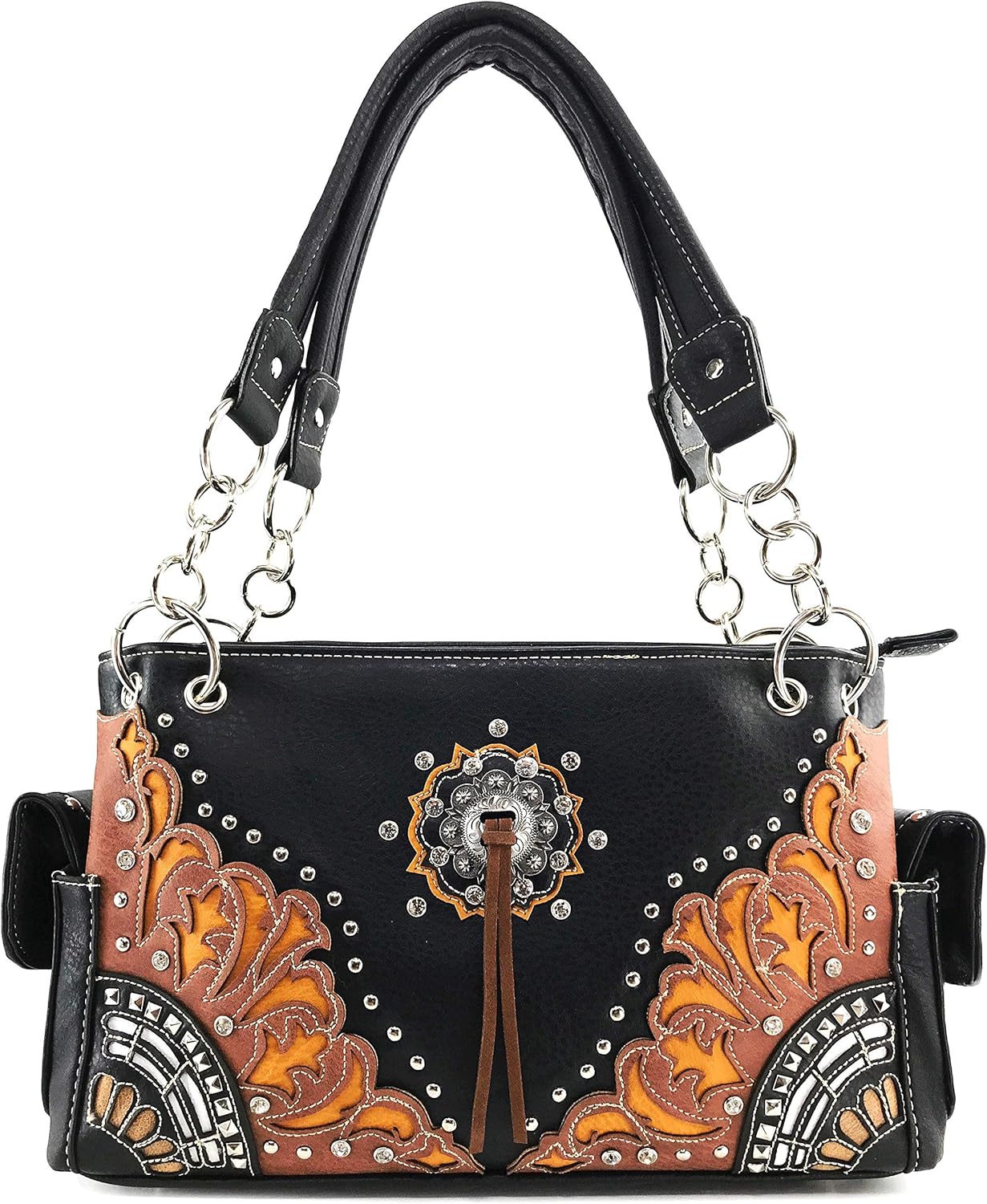 Western embroidered floral design with concho. Blend of rich vibrant colors. Our original shoulder handbags are classy with style and a gorgeous unique design. Structured rectangular shape with top handle pu leather straps for comfortable carrying and rests well on your shoulders. Interior showcases a middle zipper divider pocket, open and closed zipper pockets for better organization of your belongings. Magnetic snap flap closure side pockets for items that need quick retrieval. The back conceal carry pocket is large enough for popular handheld firearms like Glocks. Wide pocket on the back to fit your smartphone or handheld devices. Made from premium quality pu synthetic leather. Pu leather is leather made from inner splits of hide polished with polyurethane coating to deliver a more durable and sturdy purse. Fast priority shipping! Message us for any inquires and questions.