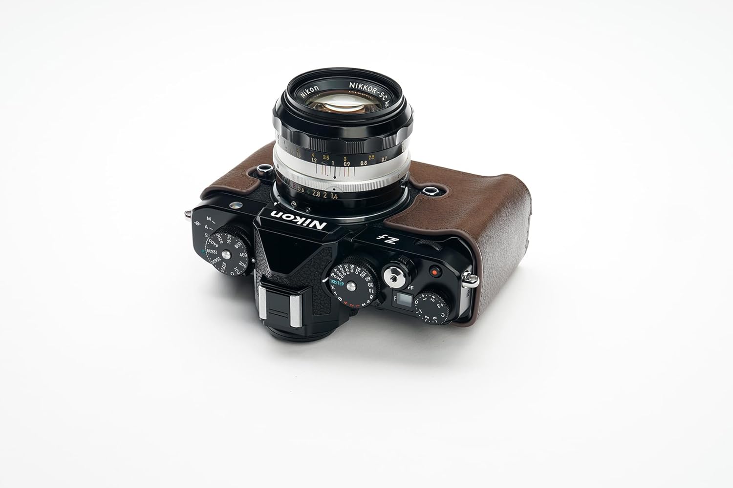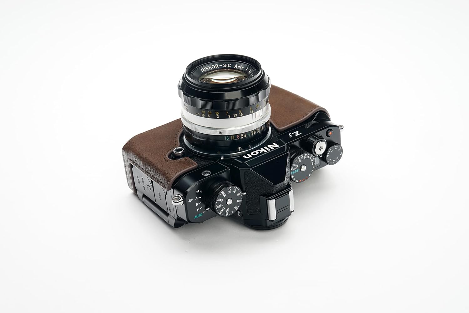 This camera is made by real top layer oil leather, the design is simple and vintage, use Metal sizing techniques make it very fit with the camera body. Inside lining use high lever velvet to protect camera body for scratch and coloration. There is a opening on the bottom for battery, You don't need to take off the half case when you change battery. Under base screw is made by copper and it can easy take off by coin. You don't need to take off the half case when you use tripod. It has a special design for Nikon ZF Camera which makes it easy to turn over the Screen and it will totally not affect screen rotation. You don't need to take off the half case when you connect data lines. Content: 1 x camera half case, 1 x Free Genuine Real Leather Hand Strap, camera not included. Material:Genuine leather.
