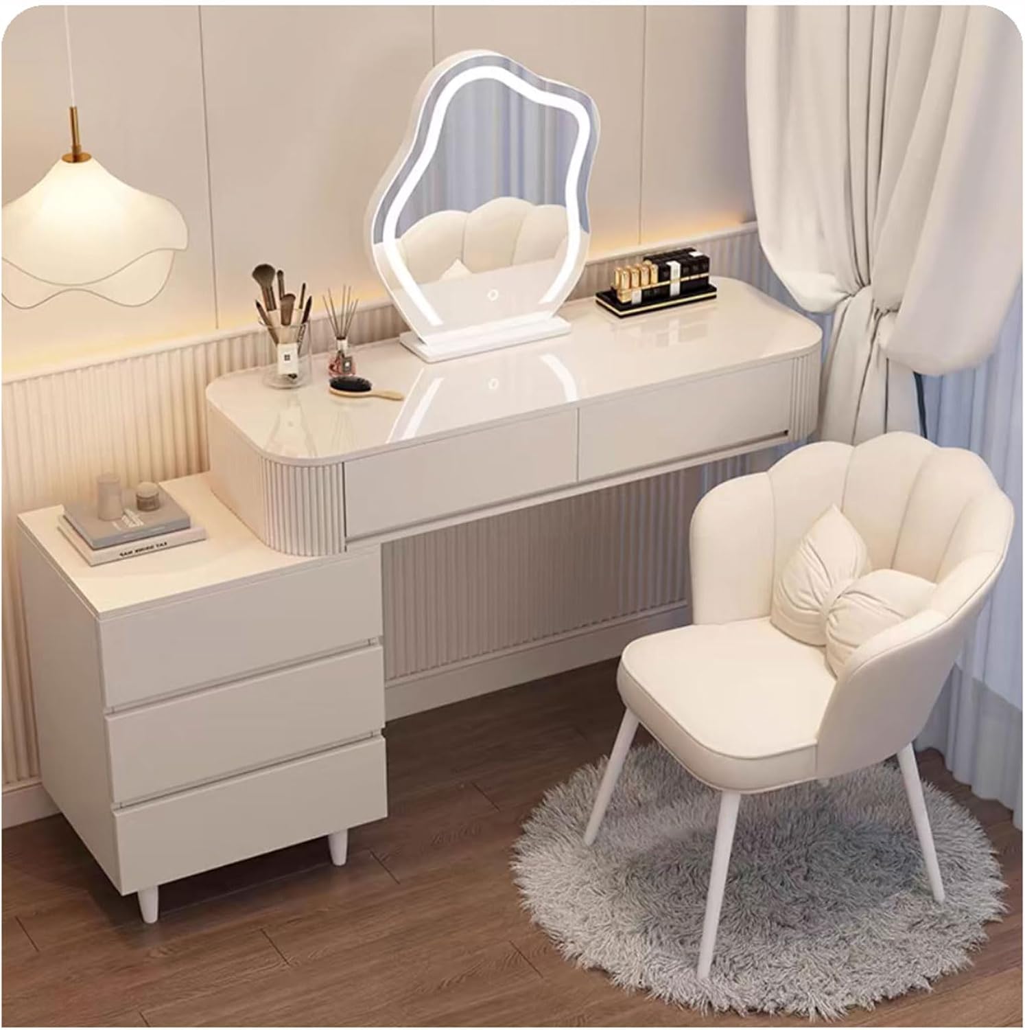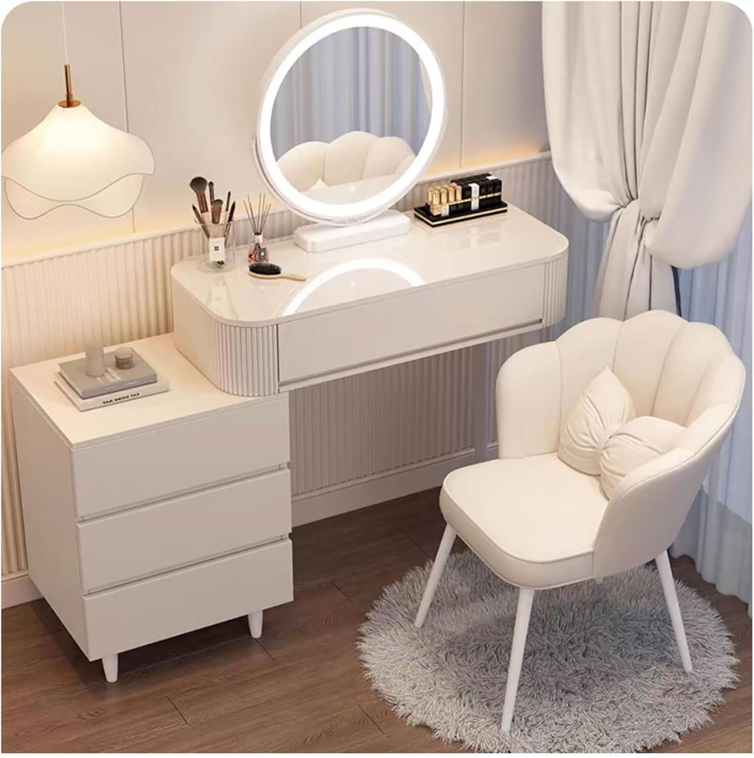 Whether it's a birthday, christmas, or wedding anniversary, this lighted dresser set combo is the perfect gift choice for mothers, wives, girlfriends, and daughters!Features of Dressing Table1. Thickened E1 grade environmentally friendly density board.2.High-definition mercury LED mirror, adjustable three-color light.3. Spacious storage countertop for makeup and storage.4. Premium smooth and silent guide rails, push and pull smoothly and quietly.5. Storage drawer + movable side cabinet design.6.The rounded corner design, effectively prevents bumps.7.Stable iron table legs with smooth lines.Product Specifications:Color: WhiteMirror Style: Round Mirror/Cloud MirrorMaterial: E1 Grade High Density Board + High Definition Mercury Mirror + IronTabletop length: 80cm/31.49; 100cm/39.37in; 120cm/47.24inTabletop width: 40cm/15.74inTabletop height: 77cm/30.31inSide cabinet length: 37cm/14.56inSide cabinet width: 40cm/15.74inSide cabinet height: 60cm/23.62inThe Package Includes:1 x Vanity Desk1 x Table Legs1 x Dressing Chair1 x Side CabinetWarm Note :1.Due to manual measure, please allow a slight measurement deviation of 1-2cm.2.Whether there is a dressing chair in the package depends on the option you purchased.(Note: The decorations in the picture are not included.)